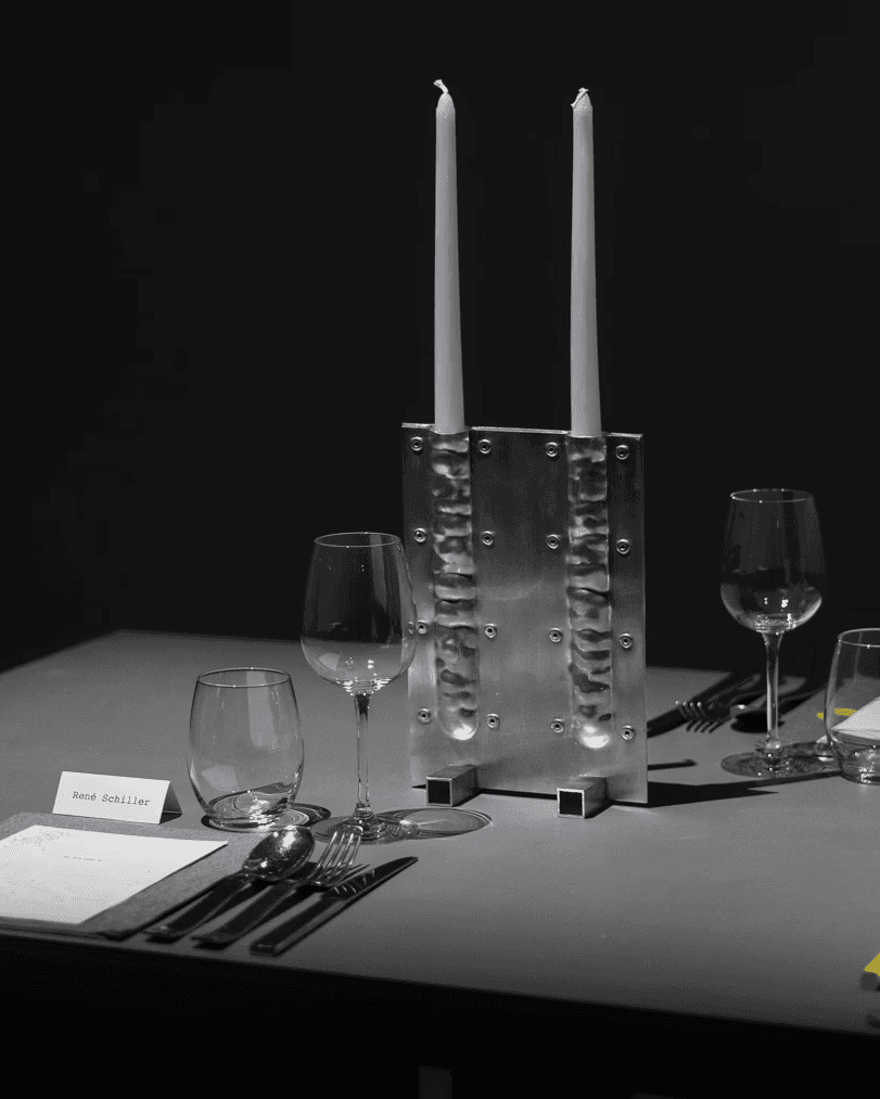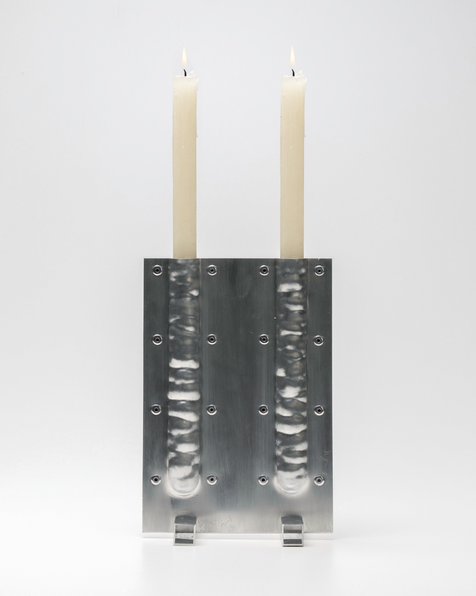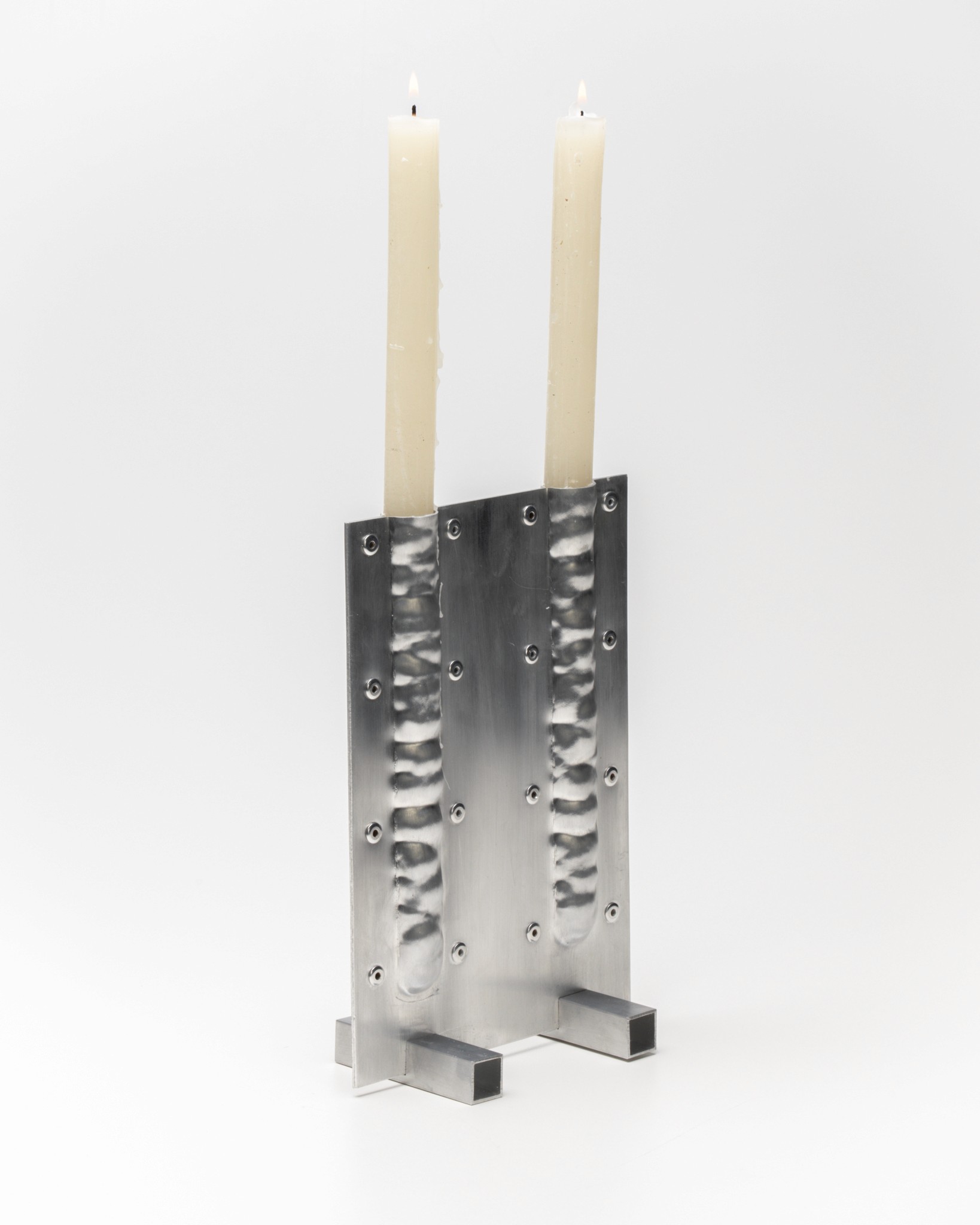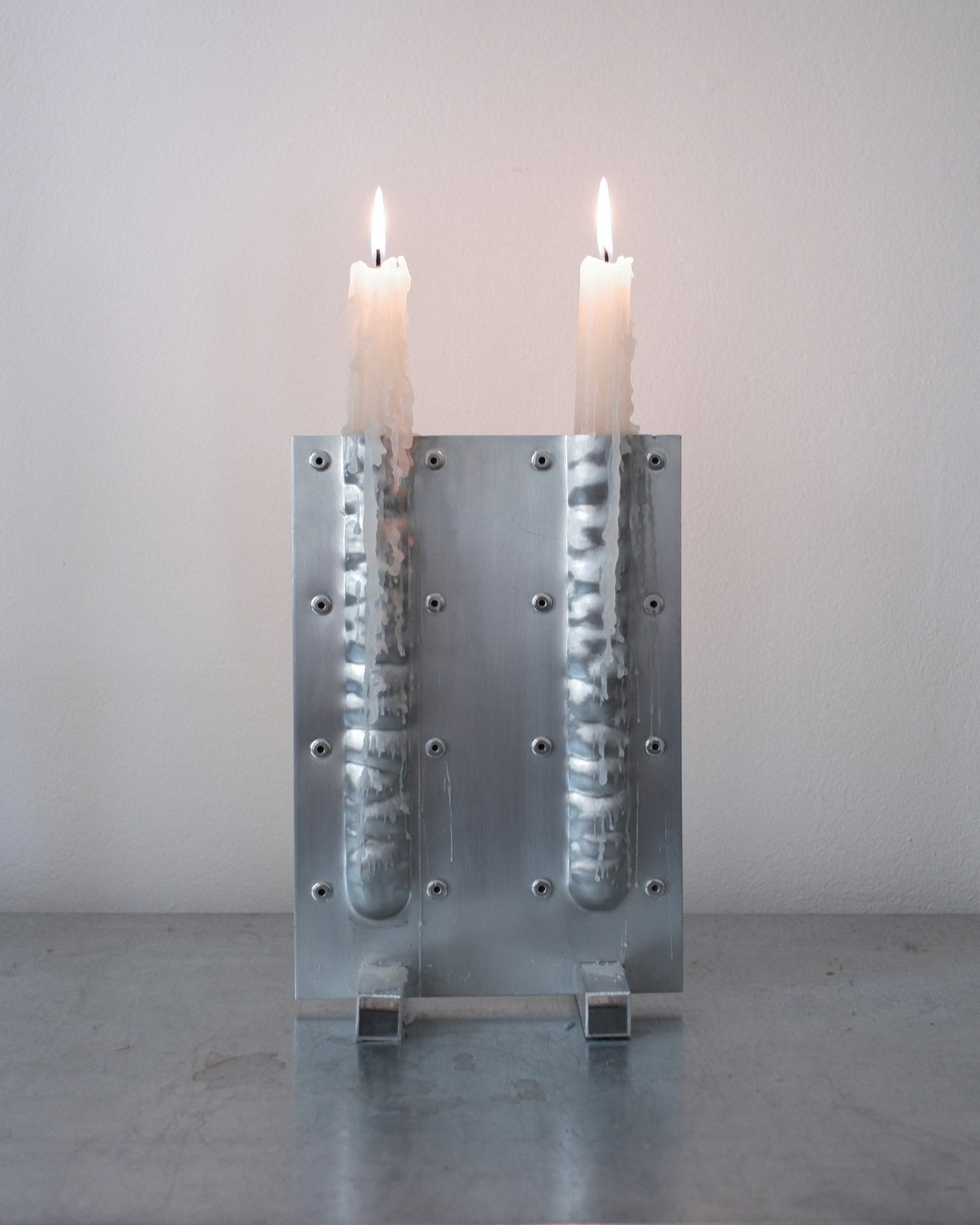 The CANDLEHOLDER is made from two aluminum parts bolted together. By hammer-forming aluminum sheets by hand, the surface develops a unique and irregular texture.