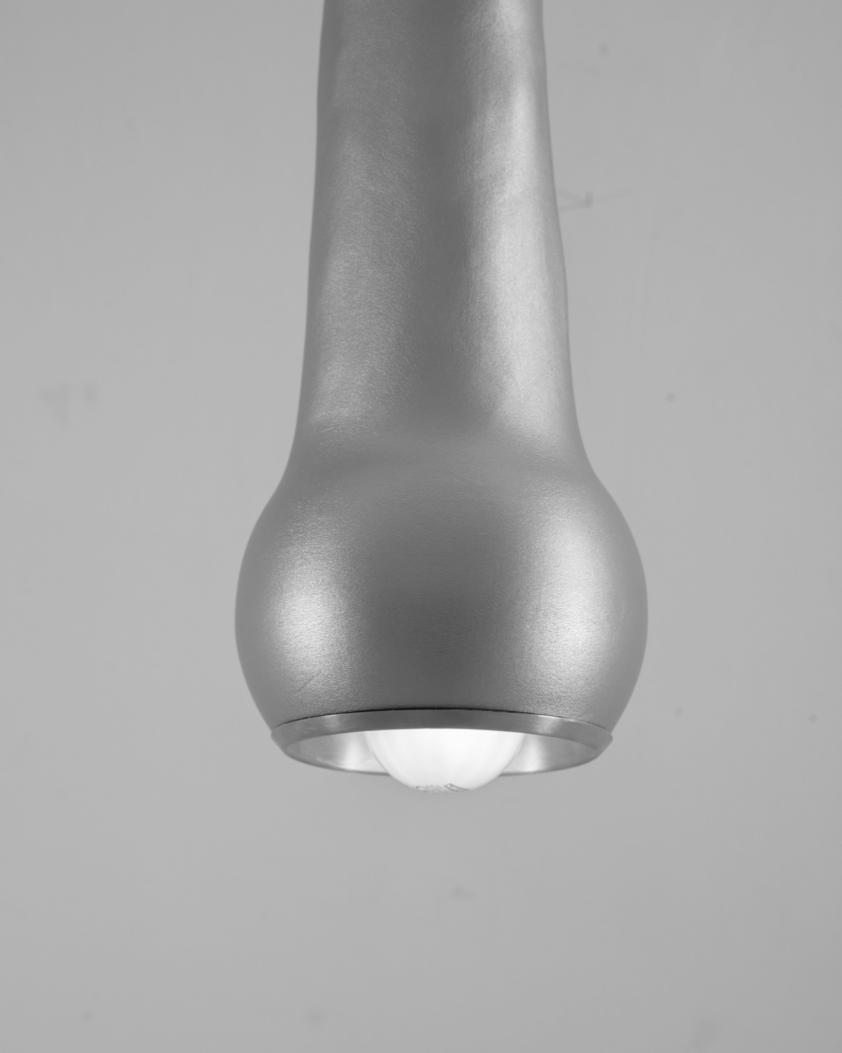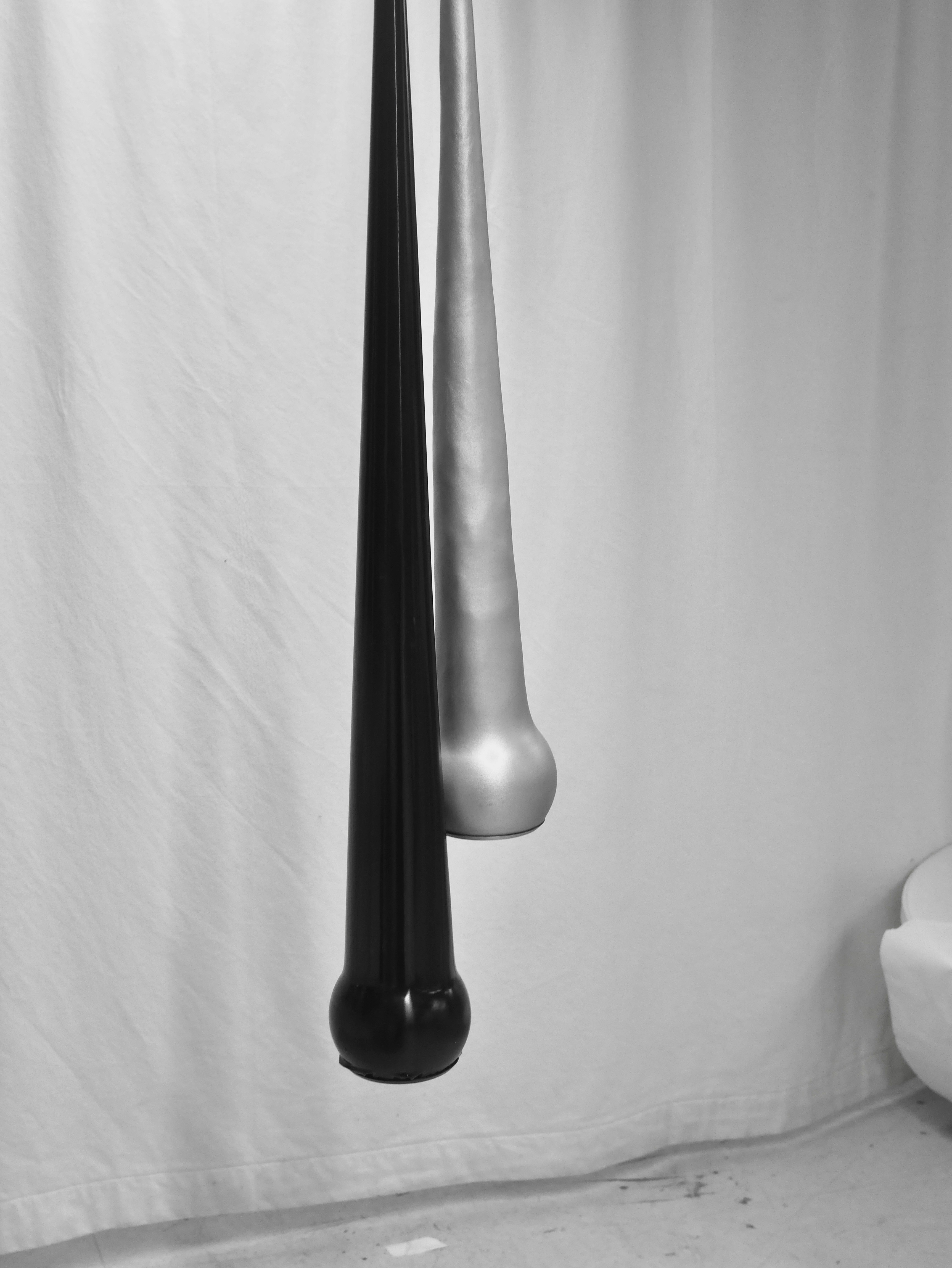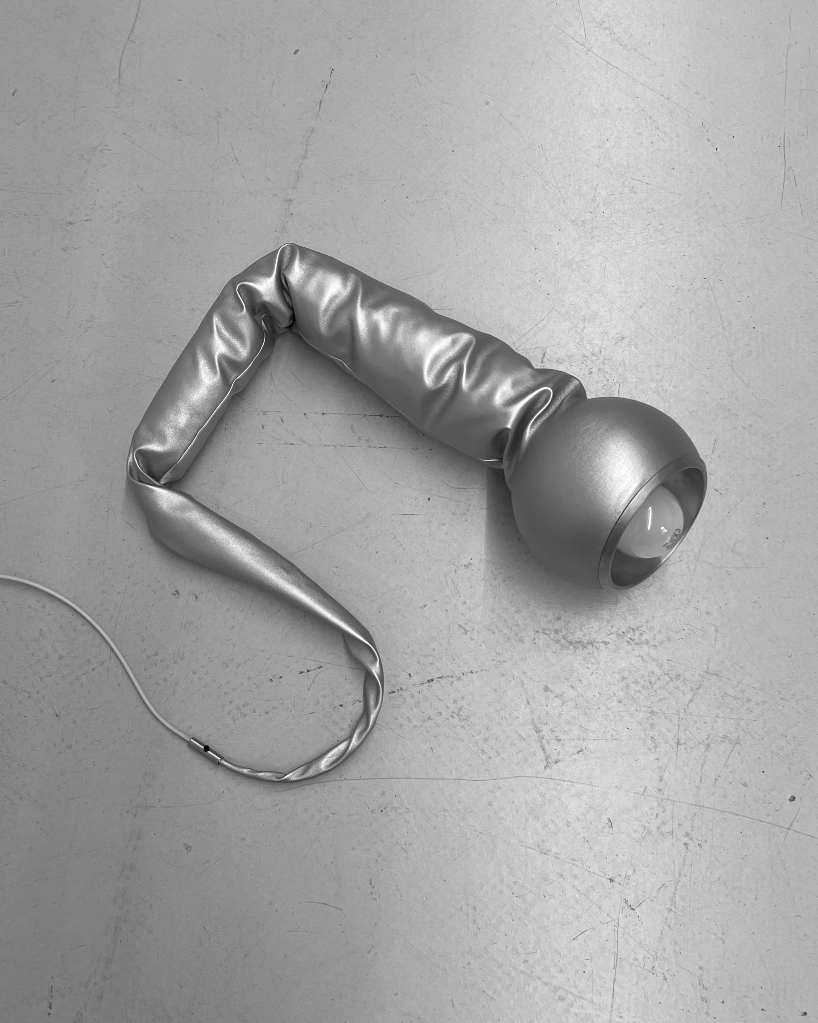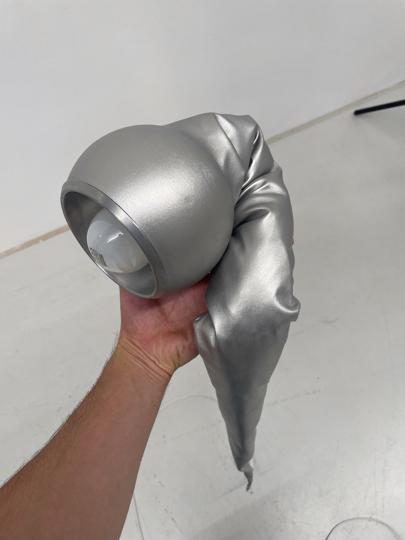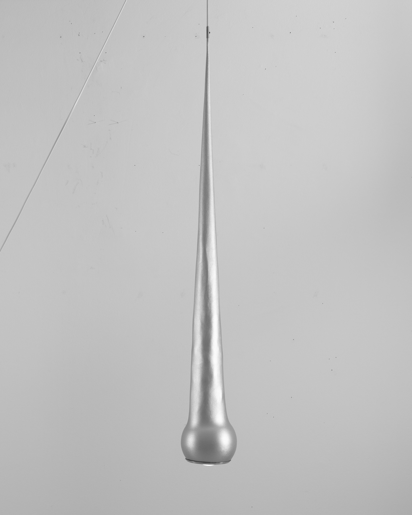 The Spike Lamp is a pendant lamp made from a metal sphere and a latex or stretch-fabric cone. The sewn cone stretches when suspended, making it appear solid.